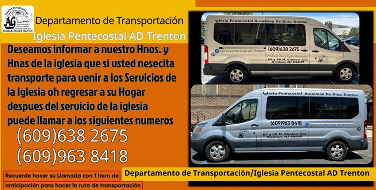 A partir del martes 7 de octubre de 2025, la Iglesia Pentecostal AD-Trenton pone a tu disposición un servicio de transportación especial para que nada te impida ser parte del servicio de adoración de las 7:00 p.m. 🙌✨